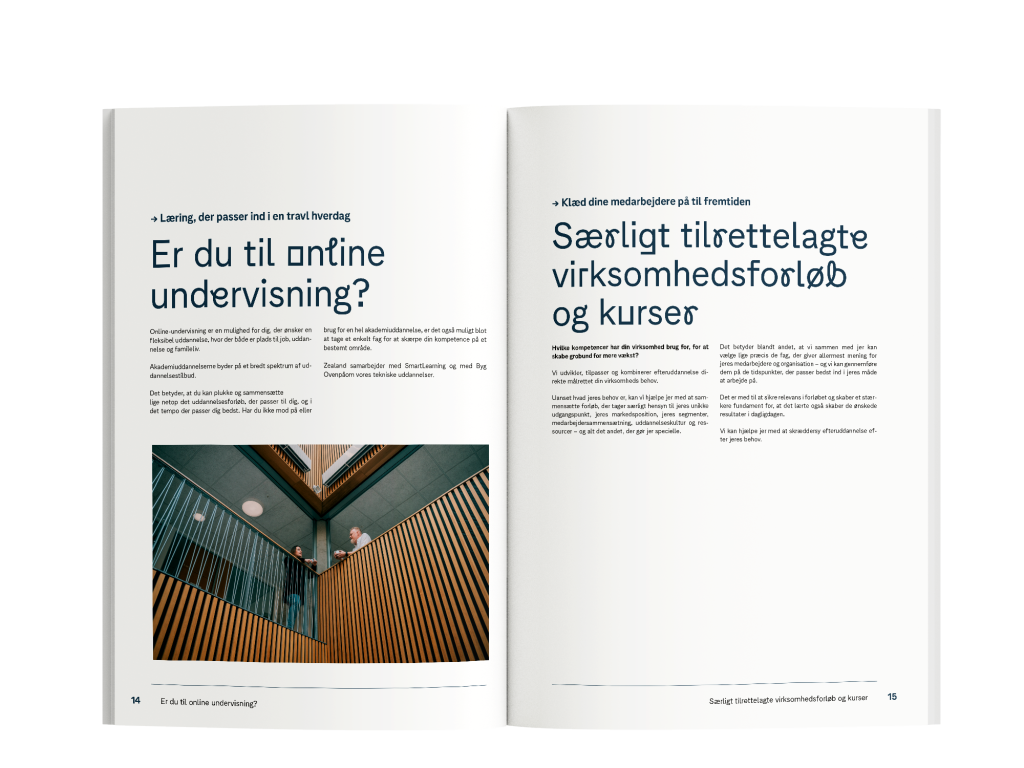 Det trykte produkt omfatter et hæfte, der er lavet til efteruddannelse på Zealand, hvor kernefaglighederne inden for typografi og grafik og billedbehandling demonstreres.